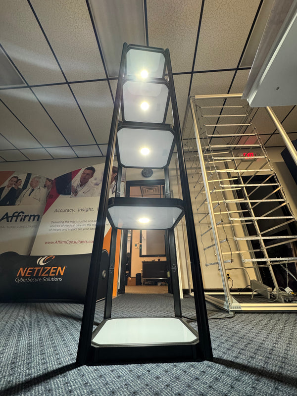 Our Twist-Lock Portable Showcase Display Cabinet Tower with 4 Shelves & Overhead Lights is the perfect solution for merchandising products at a trade show or event that will help attract visitors to your booth or improve sales in a retail environment. This display case tower includes 4 shelves with overhead lighting over each shelf. Included clear insert panels will allow booth visitors to still see within or add custom printed graphic insert panels for a truly branded look.