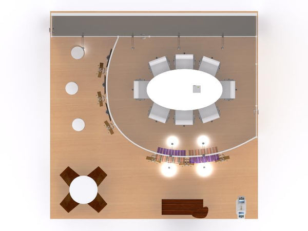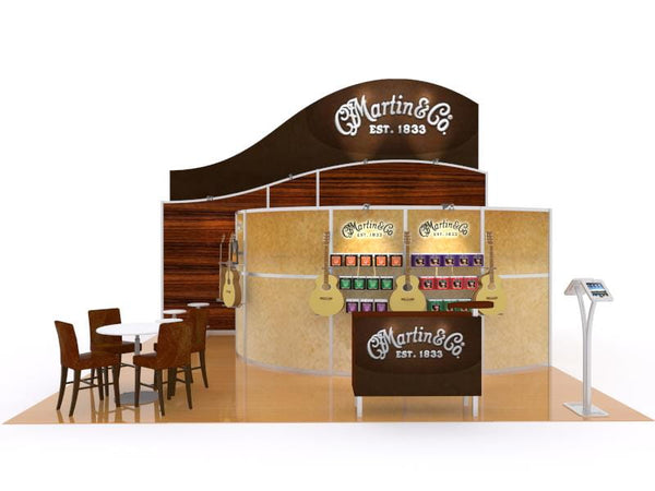 This hybrid peninsula exhibit features a striking curved tension fabric wall, creating a modern and immersive space. A spacious conference room provides privacy for meetings, while a custom reception counter with drawers ensures organization and functionality. Three interactive demo stations offer hands-on engagement, complemented by an iPad kiosk with dual anti-theft clamshells for secure digital interaction. Designed for versatility and impact, this exhibit blends technology, style, and practicality for a seamless trade show experience