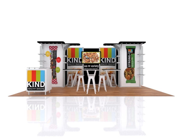 This modular trade show exhibit features twelve plex or laminated shelves for product display, a double-sided tower with graphics and locking storage, two peninsula counters, and two-piece wings made of Sintra or plex. It also includes a large monitor mount for dynamic presentations, making it ideal for engaging customers and showcasing your brand. The flexible design ensures easy setup and impactful presentation at any event.