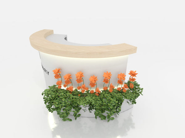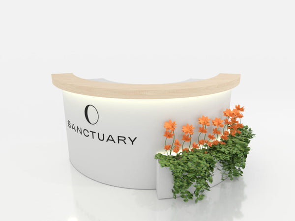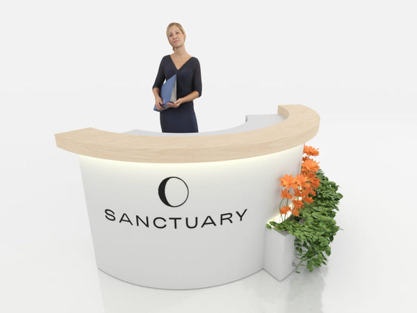This custom curved reception counter is designed to bring a modern, professional touch to your trade show exhibit. With its sleek, contemporary design, it enhances your brand’s presence while providing a functional space for engaging with visitors. The counter features open shelves, offering convenient storage for brochures, promotional materials, or personal items. The curved shape adds an elegant aesthetic, making it a standout piece in any booth. Its modular design ensures easy transport and setup, making it a versatile and stylish solution for businesses looking to create an inviting and organized environment at trade shows.