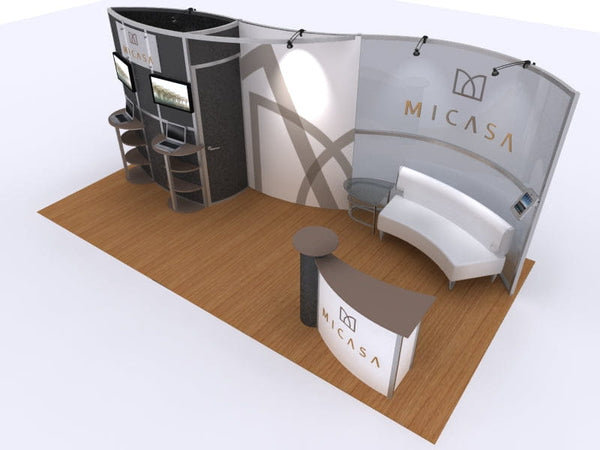 This modular hybrid trade show exhibit is designed to captivate audiences with its sleek structure and functional layout. Featuring a durable aluminum frame and vibrant tension fabric graphics, it ensures a strong brand presence on the show floor. A striking serpentine wall adds depth and dimension to the design, creating a visually engaging backdrop. Dual monitor mounts provide opportunities for interactive digital presentations, while a spacious storage closet offers secure material management. Workstation counters with locking storage and plex tops enhance attendee interaction, complemented by a stylish reception counter for a welcoming experience. Engineered for easy setup and efficient transportation, this exhibit is an ideal solution for brands looking to make a lasting impression at trade shows.
