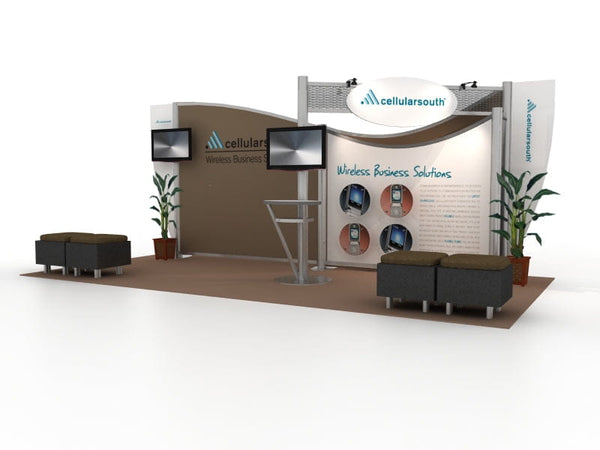 This modular trade show exhibit combines modern design with practical functionality, creating a dynamic and engaging presence. It features a bold, curved backwall with high-quality tension fabric graphics for maximum visual impact. Two tapered wings add a sleek, architectural element while enhancing brand visibility. Four monitor mounts provide multiple opportunities for digital engagement, allowing for interactive presentations and multimedia displays. Integrated laminated shelves offer ample space for showcasing products or marketing materials, ensuring an organized and professional setup. Strategically placed LED lighting highlights key branding areas, making this exhibit a standout choice for companies looking to captivate their audience at trade shows. Designed for easy assembly and reconfiguration, this exhibit delivers both style and versatility.