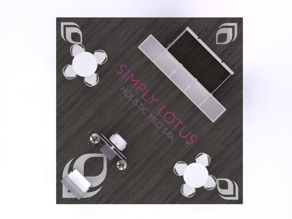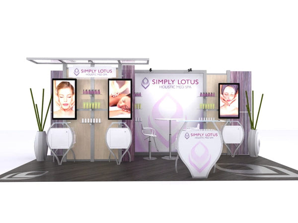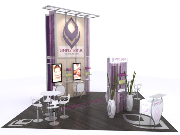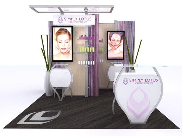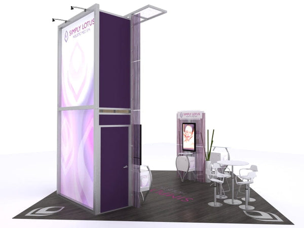 This hybrid island exhibit features a 3D logo and frosted plex sign with a vinyl logo, enhancing brand visibility. It includes a frosted plex and framed ceiling with two puck lights, two additional plex signs, and nine frosted plex shelves for product display. A closet with a door provides secure storage, while multiple brochure holders and monitor mounts ensure functionality and engagement. With integrated branding opportunities and modern technology options, this exhibit is designed to attract attention and facilitate meaningful engagement with your audience.