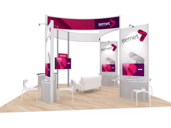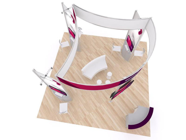 The Island Exhibit is a dynamic and adaptable trade show solution designed to enhance brand visibility and engagement. Its modular construction allows for flexible reconfiguration, accommodating various booth sizes and layouts to suit diverse exhibition needs. A reception counter with locking storage provides a secure and functional space for attendee interactions. Multiple curved counters on the towers add a sleek and modern touch while offering additional workspace. Integrated monitor mounts support dynamic multimedia presentations, making it easy to showcase digital content. A casual conference area creates a comfortable setting for networking and client discussions. Additionally, curved headers enhance the exhibit’s design, adding a distinctive and professional look that ensures a lasting impression on the show floor.