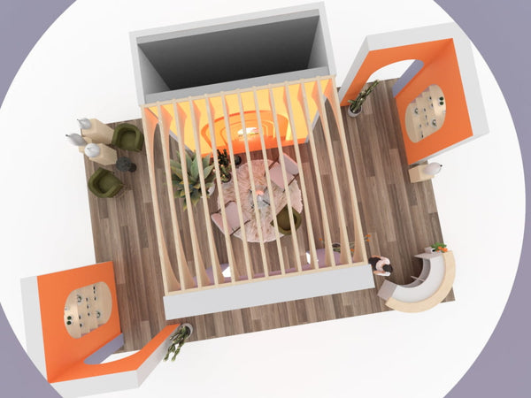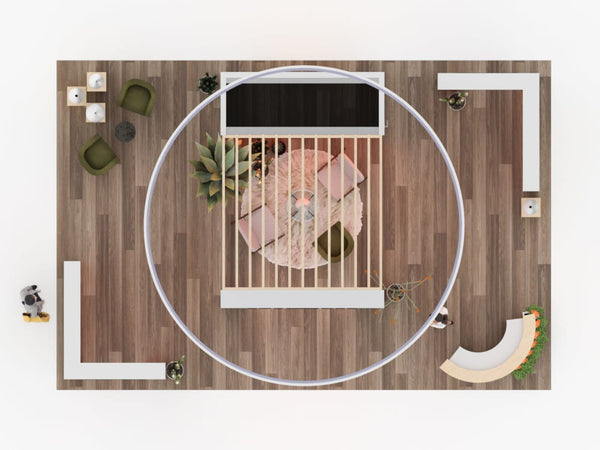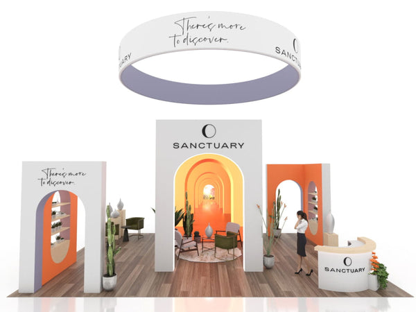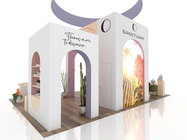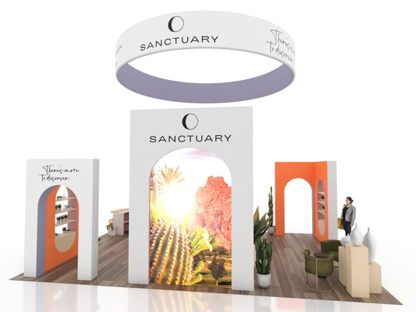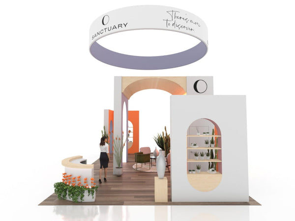 The Island Exhibit is a sophisticated and adaptable trade show solution designed to elevate brand presence and attendee engagement. Its custom modular construction seamlessly blends wood and engineered aluminum, providing both durability and a modern aesthetic. The exhibit features large-format tension fabric and direct print graphics, ensuring vibrant and attention-grabbing visuals. Corner arches with inset shelves and integrated puck lighting create inviting entry points, while the central arch structure includes a backlit archway entrance and a spacious walk-in storage closet, enhancing both functionality and design appeal. A double-sided lightbox offers high-impact branding opportunities, while a curved planter box adds a natural, welcoming touch to the space. Casual seating areas provide a comfortable setting for networking and client meetings. Additionally, a hanging sign ensures visibility from across the exhibition hall, drawing attendees to your booth. This meticulously designed exhibit combines practicality with striking design elements, making it an ideal choice for companies aiming to make a lasting impression at trade shows.