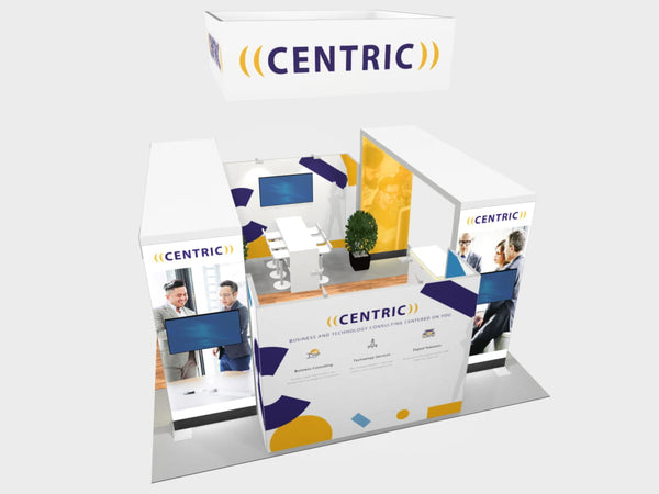 This island exhibit is designed to make a lasting impression with its sleek and functional layout. It features a striking central structure with integrated branding opportunities and three monitor mounts for dynamic digital presentations. Six strategically placed monitor mounts enhance digital engagement, making it easy to showcase videos, presentations, and interactive content. The L-shaped reception counter offers a welcoming space for attendee engagement while providing hidden storage. Thoughtfully placed LED lighting enhances visibility and highlights key messaging. With its modular design, this exhibit allows for easy customization and reconfiguration, making it a standout choice for trade shows and corporate events.