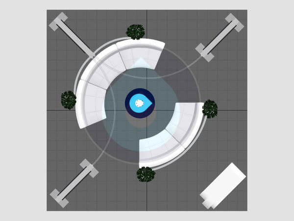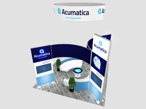 This modular island exhibit is designed to make a bold impression with its innovative and eye-catching features. Large backlit graphic panels ensure maximum visibility, while a circular hanging sign enhances brand recognition from all angles. The exhibit includes a wireless coffee table with integrated LED lights, offering a modern touch and creating an inviting atmosphere for visitors. Curved half-wall divider panels on both the front and back provide a sleek and functional design element, creating defined spaces for product displays and engagement. With its open layout, this exhibit fosters seamless visitor interaction, making it the ideal choice for businesses seeking to stand out and create a memorable presence at trade shows. Its modular construction allows for easy setup, transport, and customization to meet various branding needs.